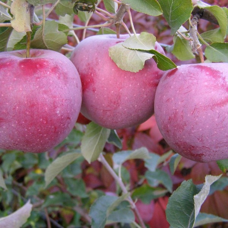 Форма яблок – округлая или округло-коническая. Поверхность – гладкая или слаборебристая. Подкожные точки серые, крупные. Урожай к осыпанию не склонен, плоды прочно крепятся к веткам. Благодаря восковому налету при поздней уборке кожура обретает фиолетовый оттенок.